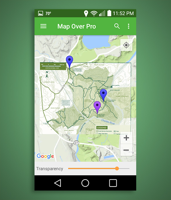 Map Over Pro provides custom overlays of any image on Google Maps. Custom image maps are 'pinned' to the Google Map with two points. The app also supports marking waypoints, a magnetic compass, and integration with other navigation apps.